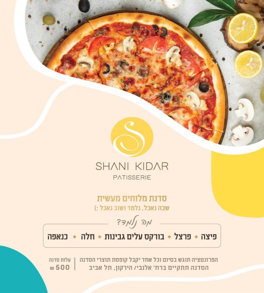 סדנת מלוחים מטורפת שלומדים את הפיצה הכי טעימה שתטעמו עם הסודות של שני! פרצעל קל וטעים ! בורקס עלים גבינות – לומדים את דרך ההכנה של בצק עלים שמרגע שתטעמו לעולם לא תחזרו לקנות בורקסים בחוץ! חלה רכה ומושלמת לשבת ונלמד ונאכל כנאפה בייתי טעים וקל להכנה